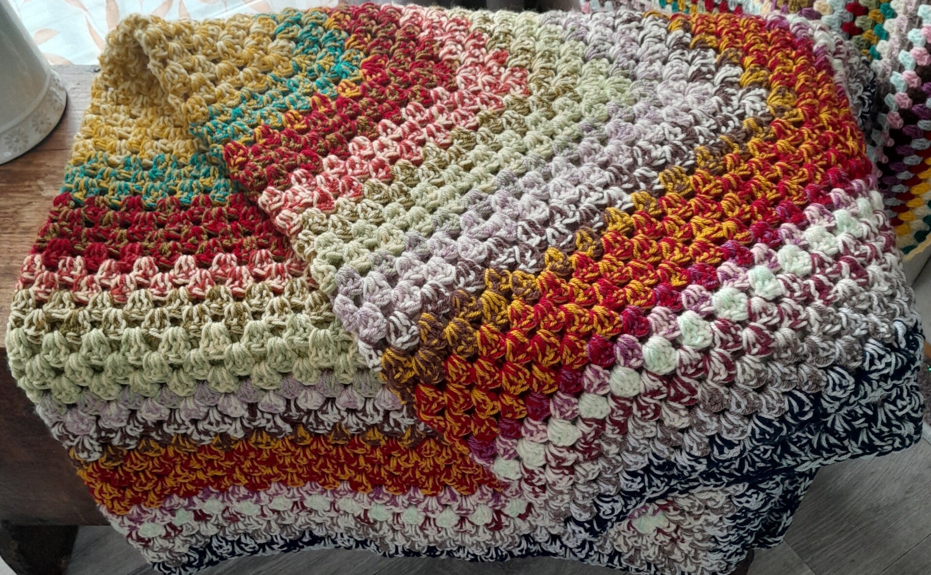 This is a fabulous blanket using surplus wool from other projects. The wool is brand new double knit and it has been double stranded for use in this blanket. It has a lovely weight to it and measures approximately 50" x 50" .