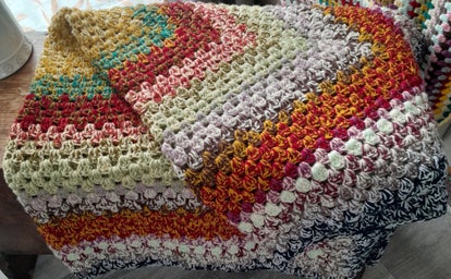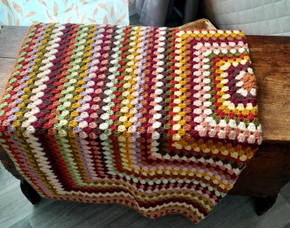 This lovely blanket looks stunning and has such a variety of colour. Made from acrylic double knit, it is fully washable and measures approximately 48" x 48". Beautiful for a spring blanket.